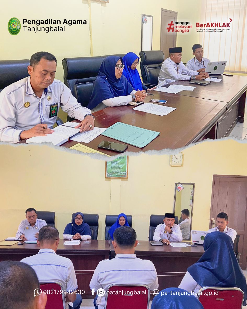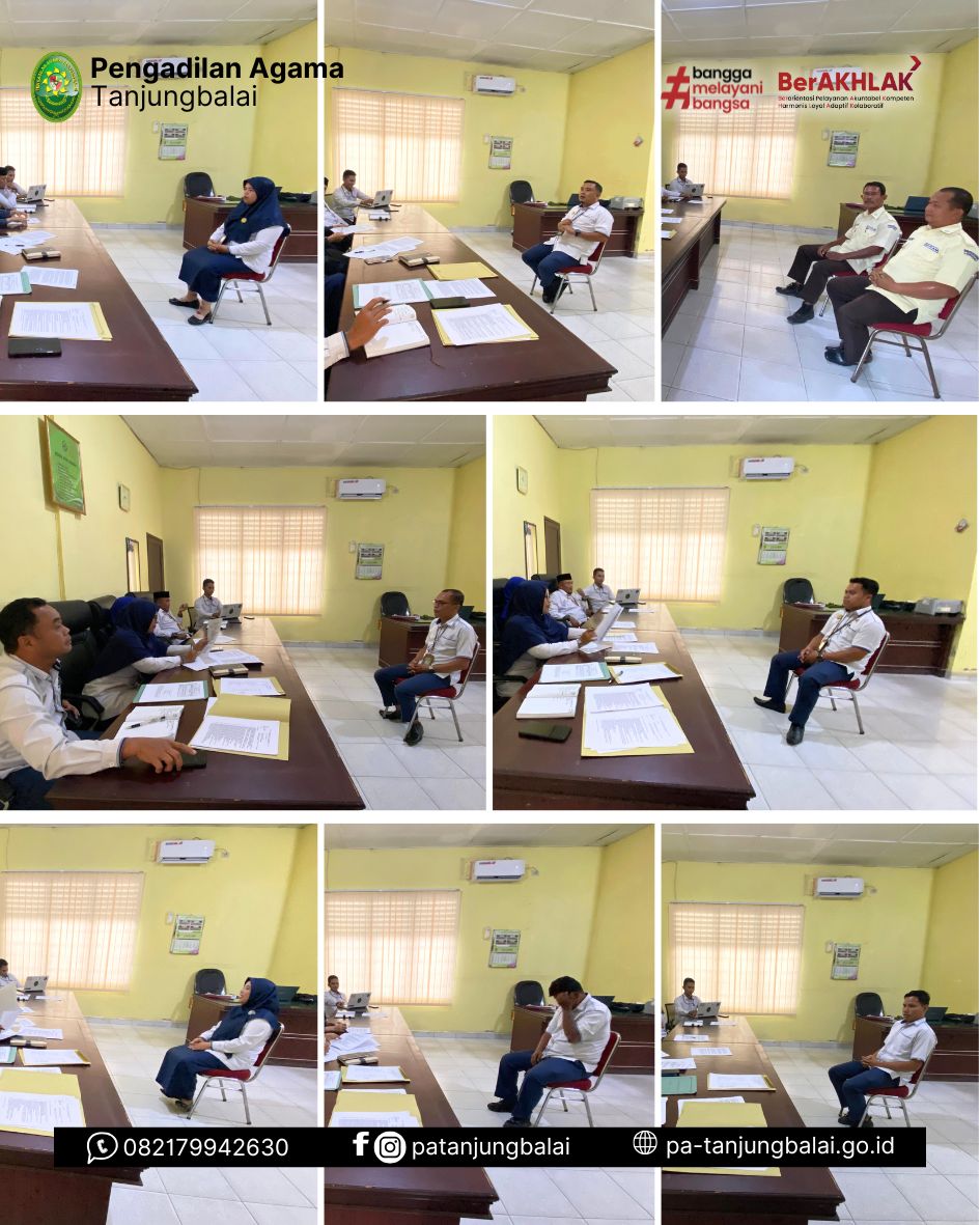 Tanjungbalai, 30 Desember 2024 Bertempat di ruang hakim Pengadilan Agama Tanjungbalai, Ketua PA Tanjungbalai Yaitu Bapak, Sarifuddin, S.H.I., M.H. Wakil Ketua PA Tanjungbalai Ibu Fadhilah Halim, S.H.I., M.H. Hakim PA Tanjungbalai Ibu Fatma Khalieda, S.Sy., M.E. Beserta Sekretaris PA Tanjungbalai, Supriono, S.H. dan Panitera PA Tanjungbalai, Eddy Sumardi, S.H. menggelar kegiatan monitoring dan evaluasi (monev) kepada Pegawai Pemerintah Non-Pegawai Negeri (PPNPN).